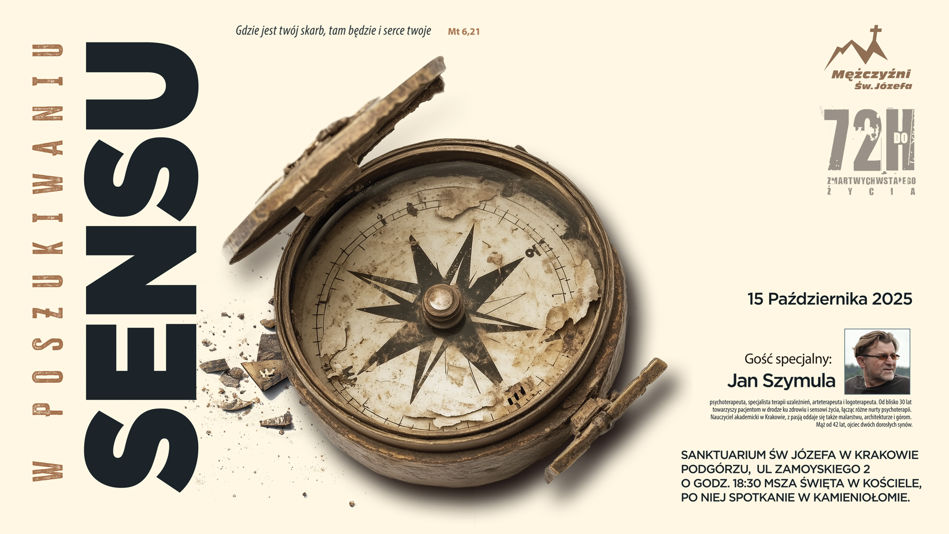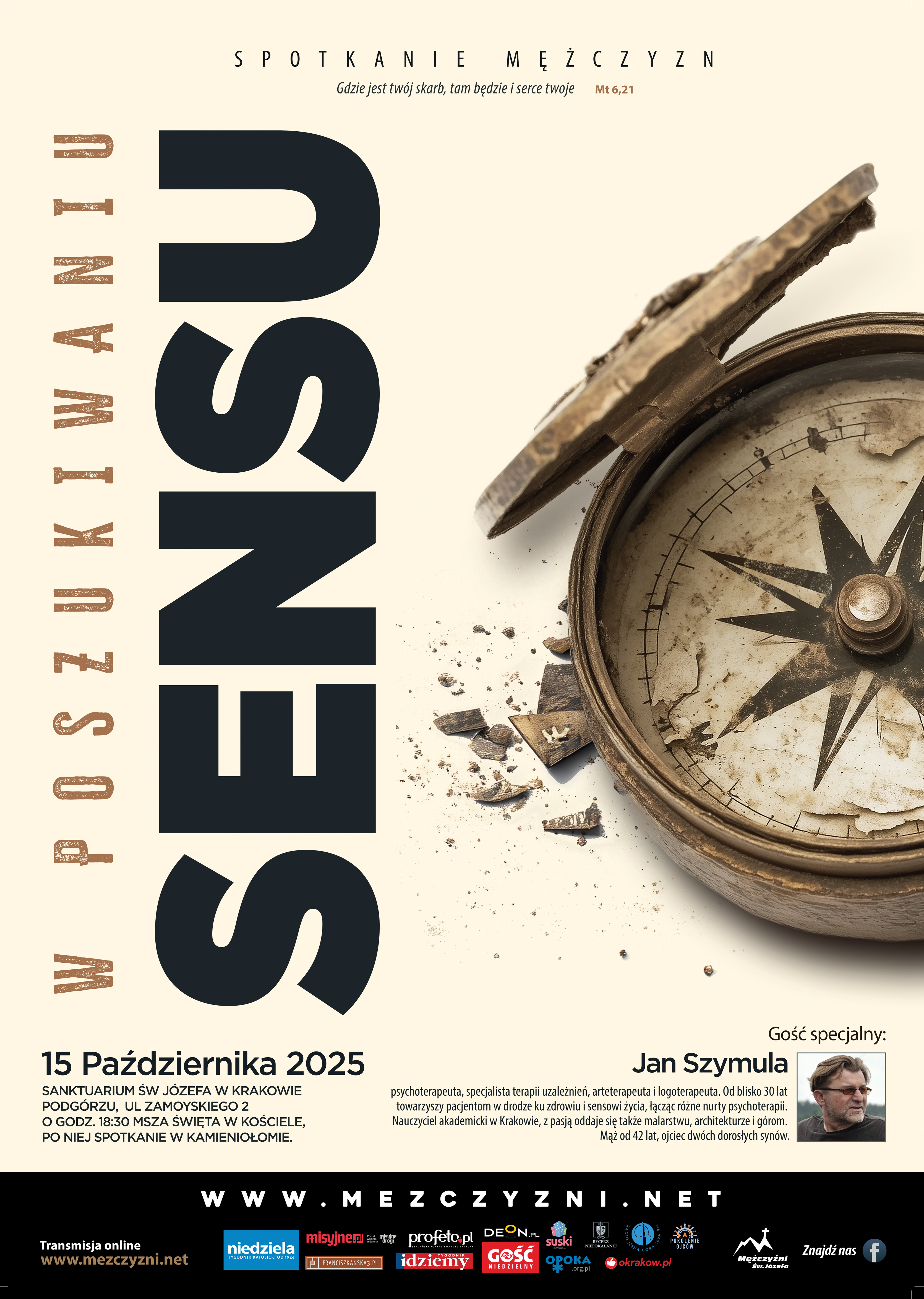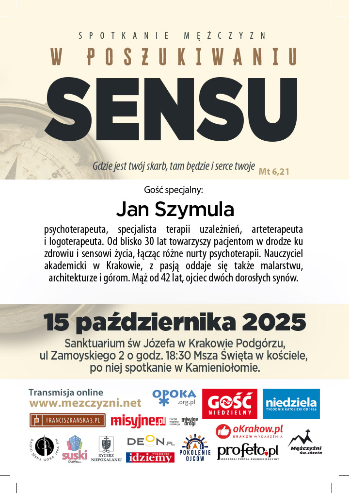 Środa 15 października 2025 odbyło się spotkanie otwarte Mężczyzn Świętego Józefa w Krakowie. Naszym gościem był Jan Szymula. Podzielił się z nami tematem: “W poszukiwaniu SENSU”